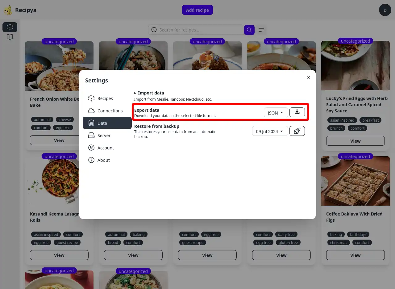 The JSON format exports all your recipes in a zipped archive organized hierarchically, with each folder containing a JSON file of the recipe. The recipe file follows the Recipe schema standard.