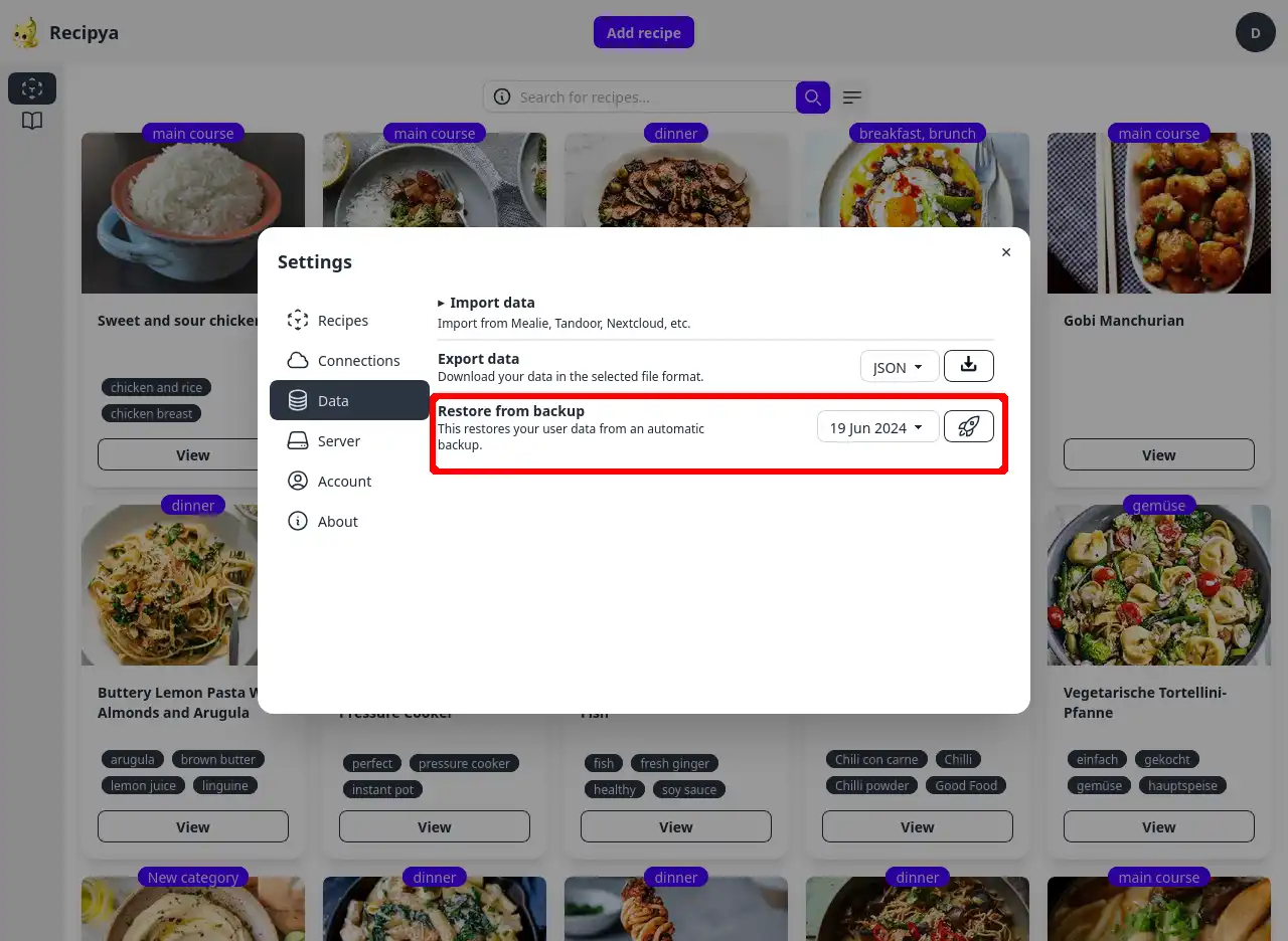 path/to/recipya/data/Backup/global/ - Décompressez la sauvegarde que vous souhaitez restaurer