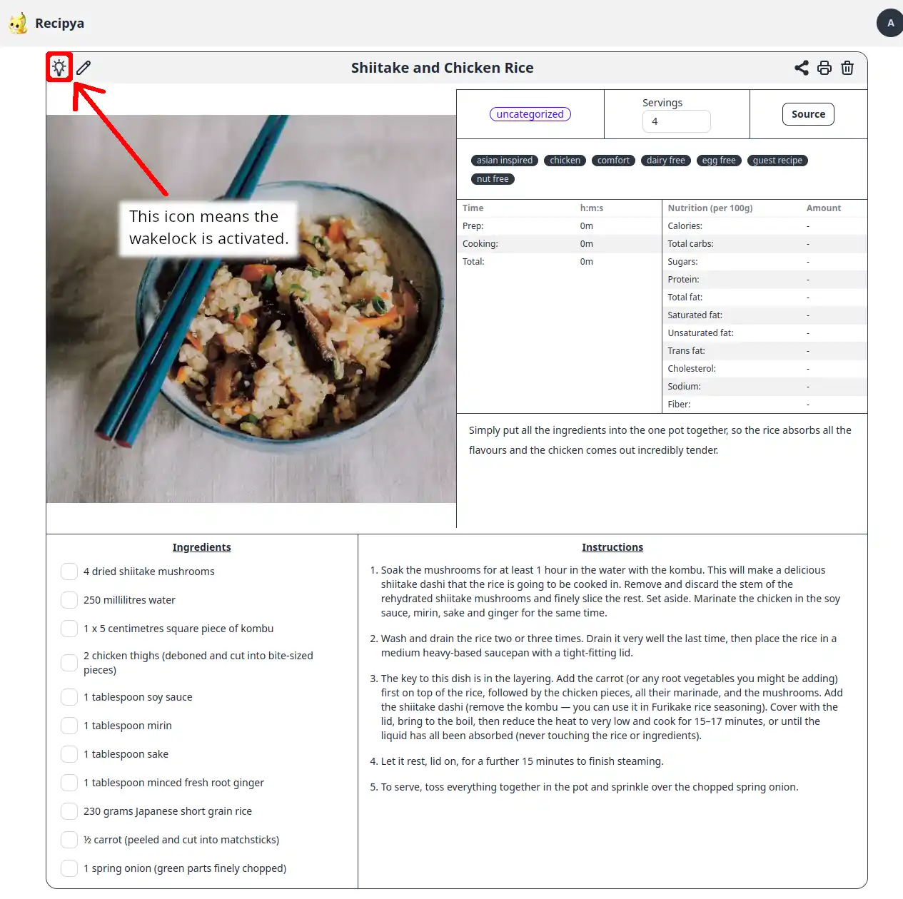 Recipya résout ce problème en fournissant un wakelock du navigateur lors de la visualisation d’une recette, empêchant ainsi l’appareil de se mettre en veille.